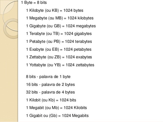 Bit and Byte Conversion Enter a number of the chosen unit of measurement in one of the fields in selected group, then click outside the text box. Byte - , the free encyclopedia The byte is a unit of digital information that most commonly consists of eight bits. No que se refere aos bits e bytes, tem-se as seguintes medidas: 1. 1 KB 1024 Bytes 1 MB Bytes 1 GB Bytes.